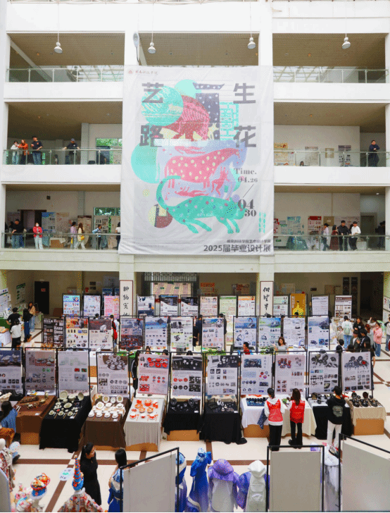 毕业设计展展出艺术设计学院2025届毕业生创作的500多件优秀作品,涵盖了手工艺产品、文创产品、绘本插画、APP交互设计、VR交互、品牌营销策划书、VI手册以及各类影视作品等多种类型。