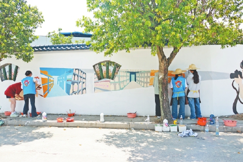 7月,赢博官方网站“Firefly”暑期实践队成员在上长治村为墙绘上色。(受访者供图)