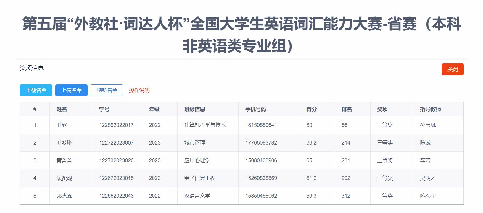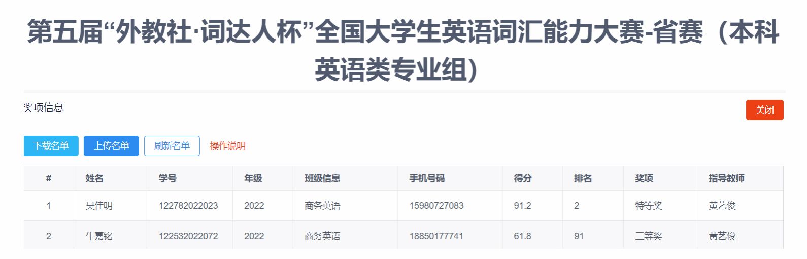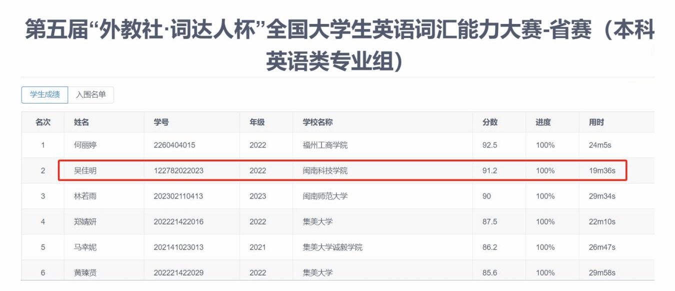本次比赛吸引了来自全省众多高校的学生参与,竞争异常激烈,比赛题型丰富多样,涵盖各大题型,全面考察选手的英语词汇理解与应用能力。比赛中,人文学院2022级商务英语的吴佳明同学凭借扎实的词汇功底和出色的临场发挥,以全省第二名(特等奖)的优异成绩成功晋级国赛,展现了赢博官方网站学子在英语学习方面的卓越风采,彰显了赢博官方网站在人才培养方面的育人成效。