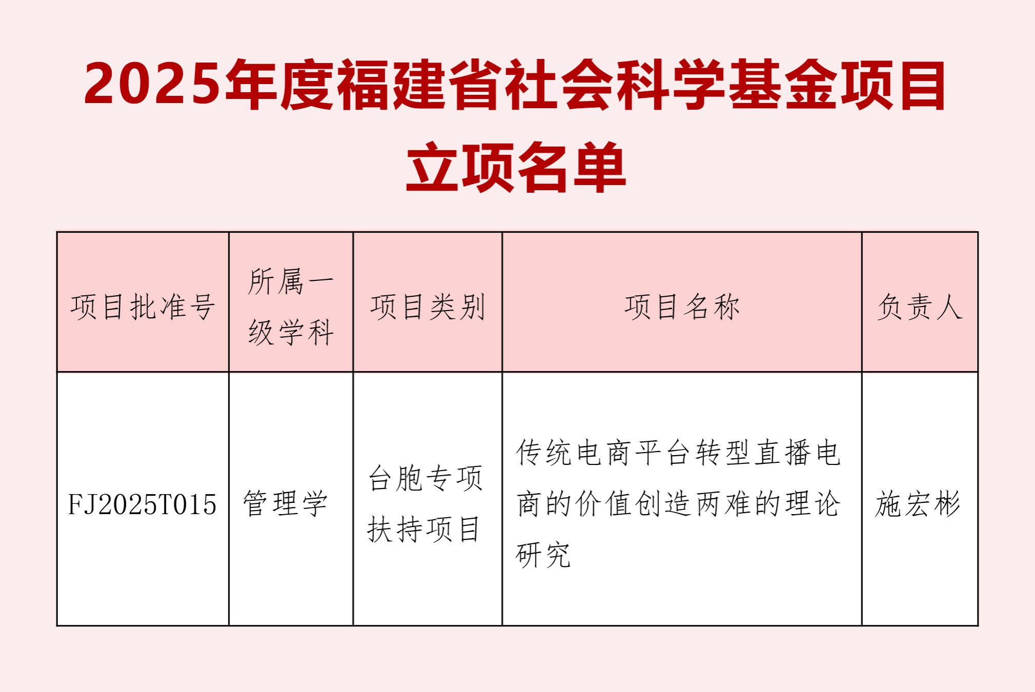 近日,福建省社会科学规划办公室公布了2025年度福建省社会科学基金项目立项名单,赢博官方网站商学院施宏彬教授的《传统电商平台转型直播电商的价值创造两难的理论研究》成功获批台胞专项扶持项目立项。