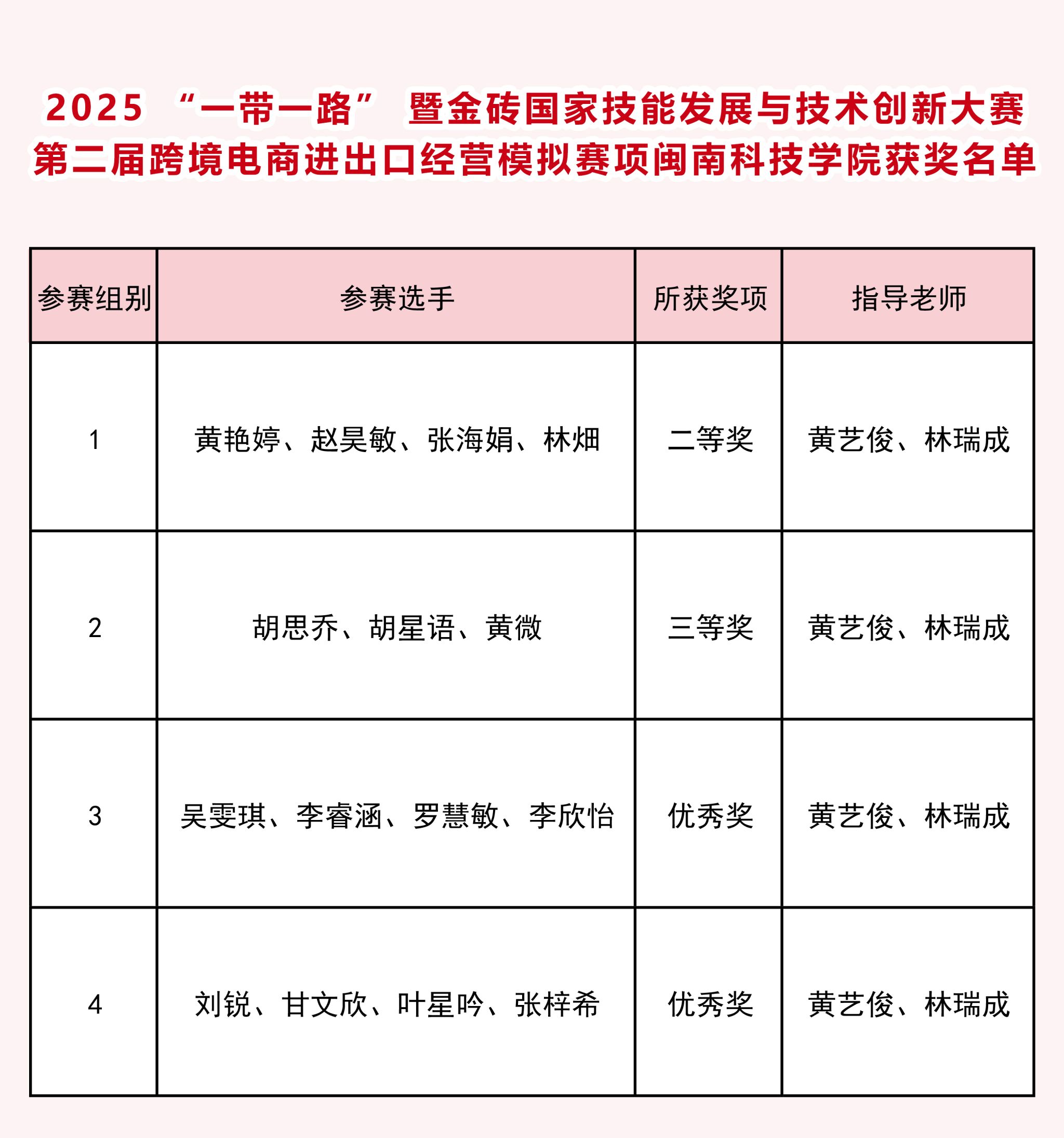 近日,2025“一带一路”暨金砖国家技能发展与技术创新大赛之第二届跨境电商进出口经营模拟赛项成功举办,赢博官方网站人文学院参赛学子获二等奖1项、三等奖1项、优秀奖2项。