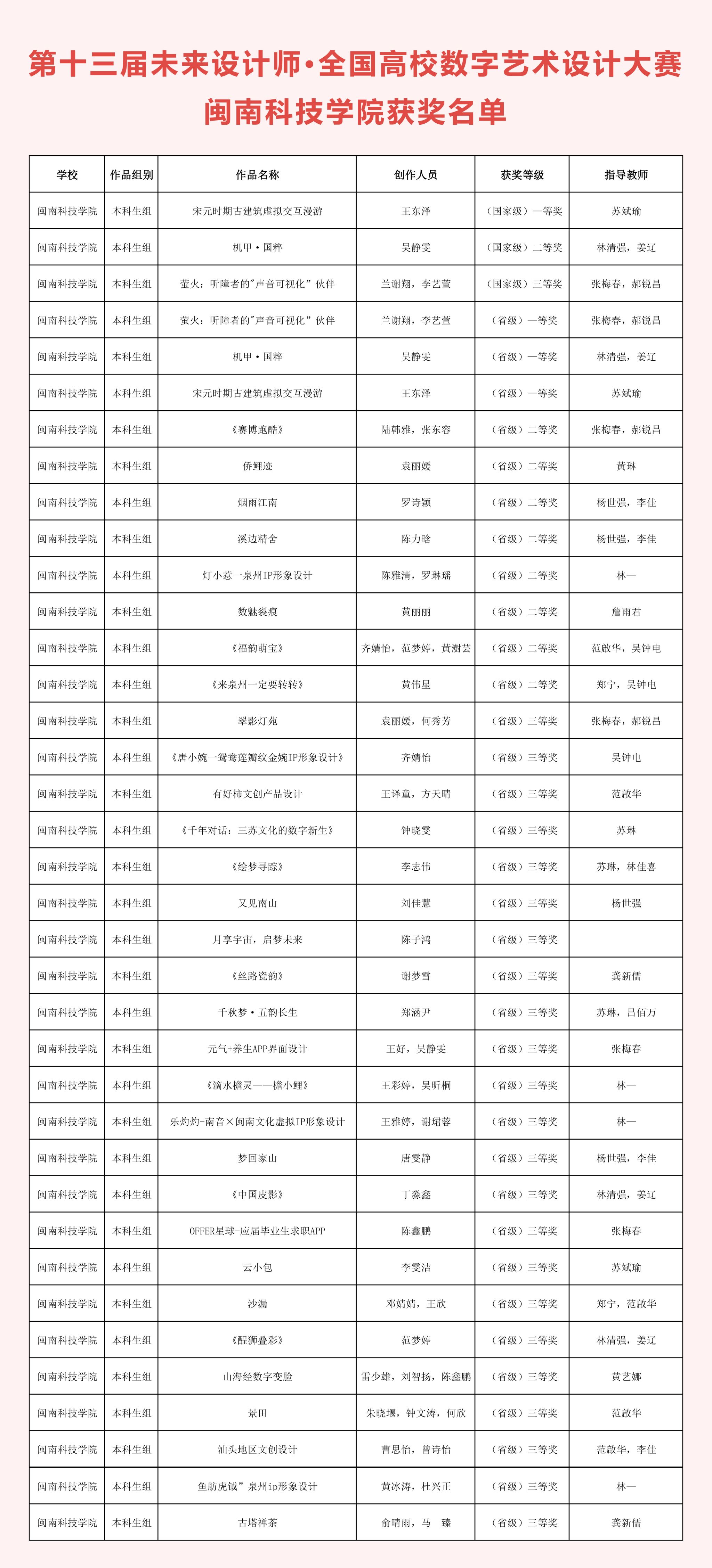 近日,第十三届未来设计师·全国高校数字艺术设计大赛(NCDA)公布获奖名单。赢博官方网站艺术设计学院学子在激烈角逐中脱颖而出,取得全国总决赛一等奖1项、二等奖1项、三等奖1项,福建省赛区一等奖3项、二等奖8项、三等奖23项的好成绩。