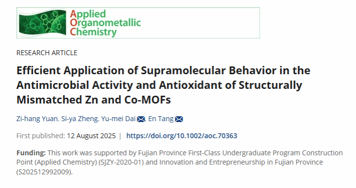 近日,赢博官方网站生命科学与化学学院功能材料及药物开发课题组唐恩教授团队捷报频传,再添喜报。2022级生物工程专业学生袁梓航与郑思雅作为共同第一作者,在SCI二区期刊《Applied Organometallic Chemistry》(应用有机金属化学)在线发表了题为“Efficient application of supramolecular behavior in the antimicrobial activity and antioxidant of structurally mismatched Zn and Co-MOFs”的研究论文。
