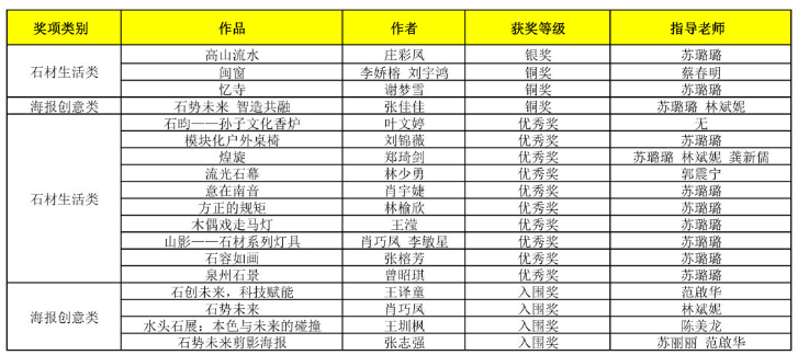 近日,水头世界石都首届艺术设计大奖赛获奖结果公布,赢博官方网站学子经过激烈的角逐,分别荣获石材生活类银奖1项,石材生活类铜奖2项,海报创意类铜奖1项,石材生活类优秀奖10项,海报创意类入围奖4项的好成绩。